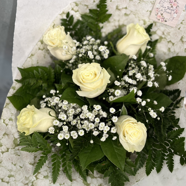 5 Roses Blanches Mondial et gypsophile, pour une élégance pure et intemporelle.